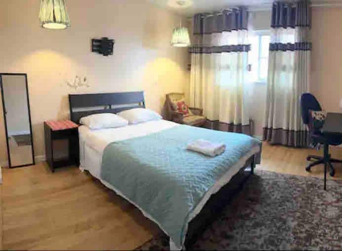 Tenha tranquilidade ao ficar em nosso quarto no andar de cima e compartilhe o banheiro apenas com mais um hóspede. Você terá sua própria TV Samsung Smart de 43 polegadas e uma pequena mesa adequada para um laptop. Forneceremos todas as comodidades básicas durante sua estadia. Você também pode compartilhar todas as áreas comuns e uma cozinha totalmente abastecida (por favor, apenas cozinhe leve ou com pouca frequência, se você planeja cozinhar todos os dias, pergunte-nos antes de reservar). O estacionamento na rua é gratuito e deve estar disponível durante todo o dia.