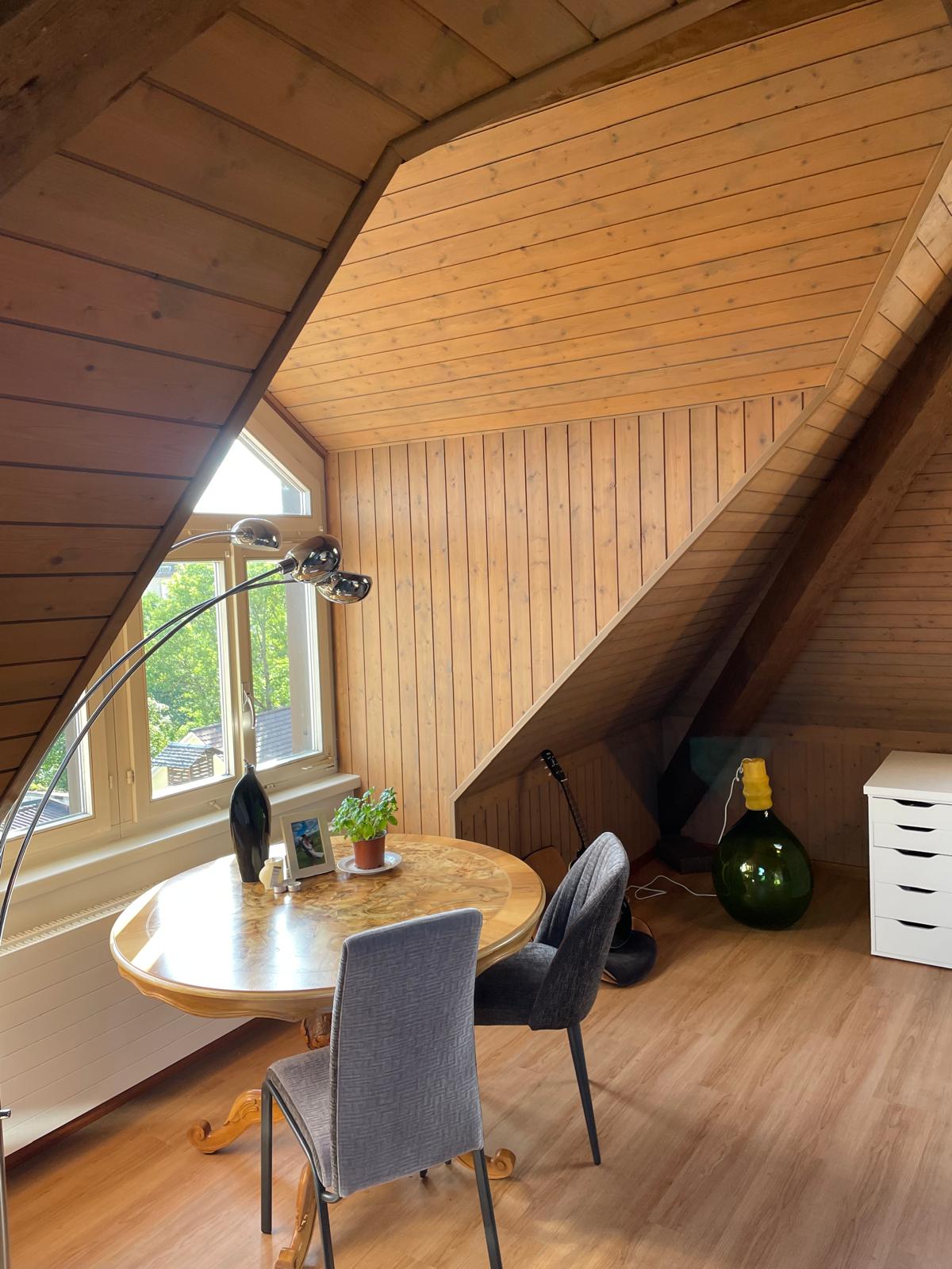 O quarto está localizado em uma grande casa com jardim em uma vila idílica. Está equipado com tudo o que você precisa para viver e trabalhar. O quarto tem cerca de 40 m² e tem pé direito alto e vigas de madeira. Há uma cama de casal grande, uma escrivaninha, um guarda-roupa e uma televisão. A casa está localizada em um ambiente tranquilo e verde. Você pode relaxar aqui e deixar sua alma vagar.