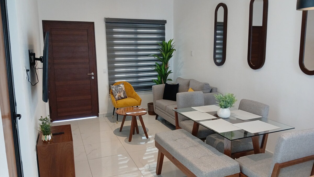 Apartamento tipo loft estilo moderno-mexicano, totalmente mobiliado, com ar condicionado, 1 cama de casal, sala com sofá-cama, closet, banheiro completo, cozinha integrada, sala de jantar, smart TV, internet no apartamento e nas áreas comuns, máquina de lavar e secar roupa de uso comum, áreas verdes, serviço de entrega de restaurantes na área e excelente localização dentro da Plaza Luna Lima.