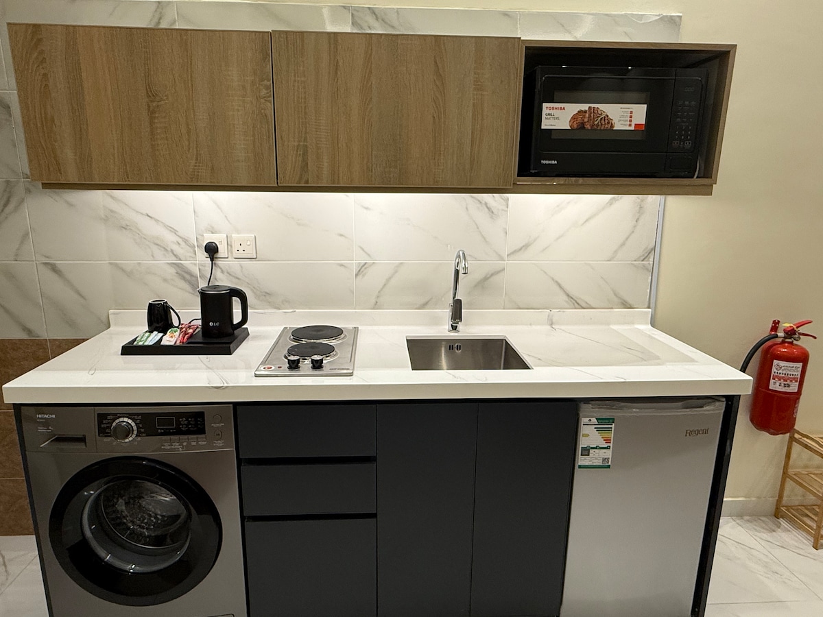 Hospede-se em um estúdio elegante e limpo na área industrial de Yanbu — a apenas 7 minutos da praia da Comissão Real e a 5 minutos da área industrial pesada. Desfrute de uma cama queen size, TV de tela grande, acesso Wi-Fi gratuito de alta velocidade. A cozinha totalmente equipada, o banheiro moderno e a área de estar aconchegante oferecem tudo o que você precisa para uma estadia relaxante. Perfeito para casais, viajantes individuais ou viagens de negócios — conforto e conveniência.