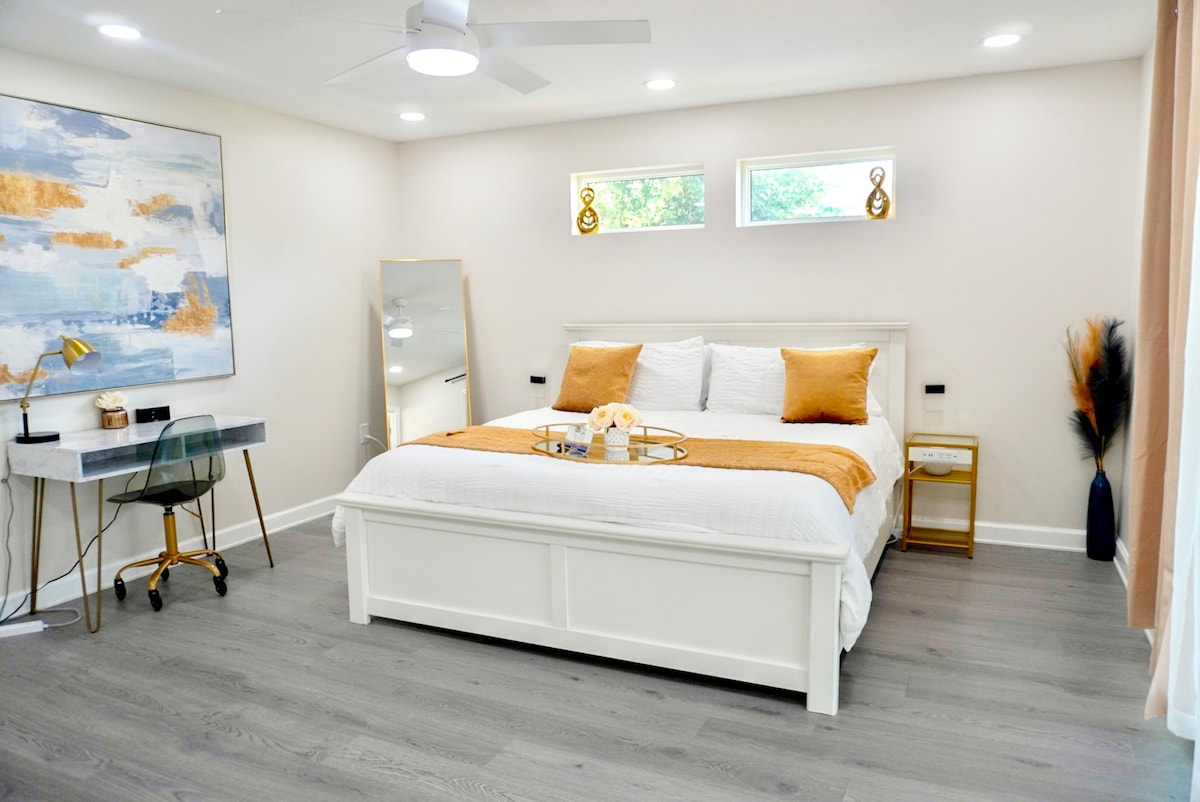 Grande estúdio contemporâneo localizado no coração da histórica Tampa Heights! Entrada privativa, estacionamento gratuito, itens essenciais fornecidos, além de Netflix, Disney+ e HBO Max. A 2 quarteirões a pé do salão de alimentação Armature Works e Tampa Riverwalk, trilha de 2,6 milhas à beira-mar do centro da cidade. A menos de 1,6 km da cidade de Ybor, do centro da cidade e dos restaurantes, cervejarias e muito mais da moderna área de Seminole Heights. Dirija-se rapidamente para South Tampa e Bayshore Blvd. Praias locais a aproximadamente 30 milhas de distância, pulando na entrada da I-275 nas proximidades!