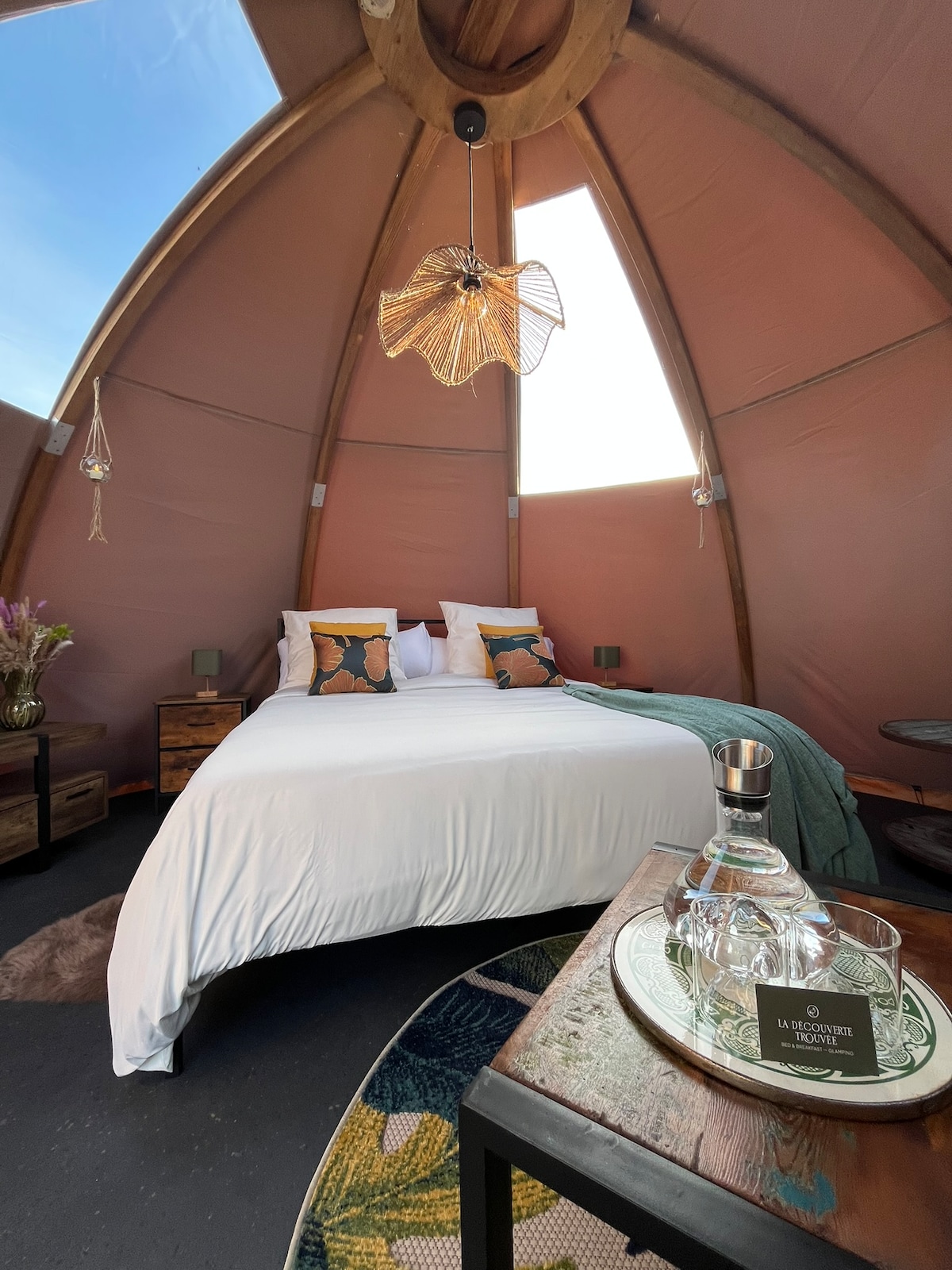 Dôme Demoiselle is een elegante en intieme dome. Onder de lichte koepel ontstaat een sfeer van rust, verfijning en verbondenheid. Net als de kraanvogel demoiselle, symbool van gratie en verbinding, belichaamt deze plek evenwicht en harmonie.Een tijdloos verblijf waar natuur en comfort elkaar ontmoeten. Dôme Demoiselle is geschikt voor twee tot drie personen en beschikt over een queensize bed en een slaapbank. De privébadkamer bevindt zich in het sanitaire gebouw en is exclusief voor deze dome.