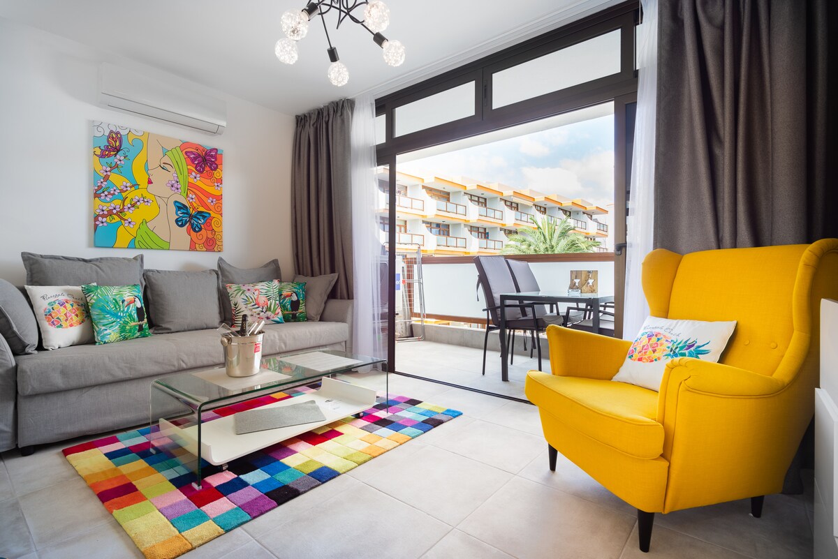 Belo e moderno apartamento completamente renovado com um quarto, uma sala de estar com cozinha totalmente equipada e uma agradável varanda (vista para a piscina). Duas condições tranquilas de ar Wi-Fi de fibra de alta velocidade gratuito e bom local de trabalho. Máquina de lavar roupa. A 500 metros da bela praia de Maspalomas, do outro lado da rua, grande supermercado e super perto do centro de Yumbo (5 min a pé). Um terraço maravilhoso (montanha e vista para o mar), onde você pode relaxar e tomar sol com ou sem roupas (o elevador leva você facilmente para cima)