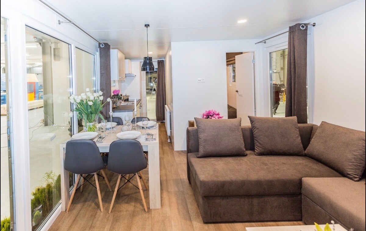 O espaço é perfeito se você quiser fazer uma pausa relaxante do estresse da vida cotidiana. A propriedade tem 2 quartos, cada um com 2 camas box spring. O sofá é extensível e pode ser usado como uma cama extra. O alojamento é particularmente adequado para famílias, casais, viajantes de negócios e instaladores. Com seus inteligentes 41 m² de espaço, a acomodação móvel tem tudo o que você precisa para uma estadia relaxante.