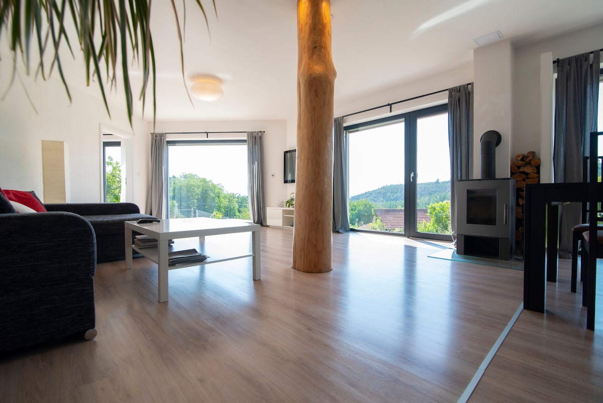 A casa está situada em uma colina com vistas deslumbrantes para a Floresta da Boêmia e para a cidade de Strazov. Na cidade, há um restaurante, mercearia e comodidades cívicas básicas. Você quer ficar na minha casa se você gosta de viagens ao redor do campo, quer ir caminhar nas montanhas ao redor ou procurar tranquilidade.