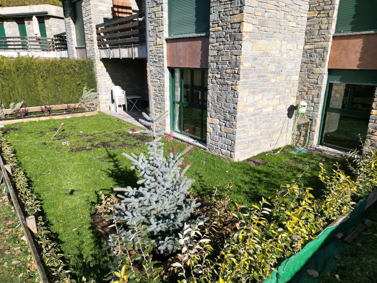 Apartamento acolhedor no térreo em Villanúa 🏔️ com um espaçoso terraço em forma de jardim, perfeito para cafés da manhã ensolarados ou jantares à luz das estrelas. Ideal para casais ou famílias que amam esquiar ⛷️, caminhar 🥾 e a natureza🌲. Wi-Fi, Smart TV, cozinha completa, ar-condicionado e aquecimento. Animais de estimação são bem-vindos mediante pedido. Estacionamento fácil na porta e a poucos passos para acessar. Desfrute de um retiro encantador no coração dos Pirenéus espanhóis.