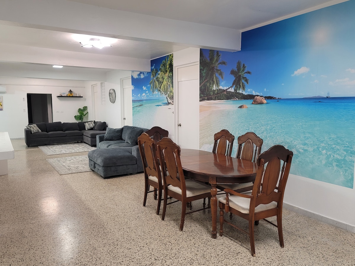 Apartamento espaçoso com jardim remodelado. Excelente para retiro com famílias e amigos. Jardim/pátio permite lazer ao ar livre e churrasqueira. Três quartos que acomodam confortavelmente 7 pessoas. O complexo inclui piscina, quadras de tênis e quadra de basquete. Atividades para todos - caminhadas na floresta tropical de el Yunque, praia de Luquillo, passeios a cavalo, tirolesa e carrinhos nas proximidades. Curta viagem de carro até Wyndham Resort & Casino. Ótima comida local e restaurantes nas proximidades e a 35 minutos do aeroporto.