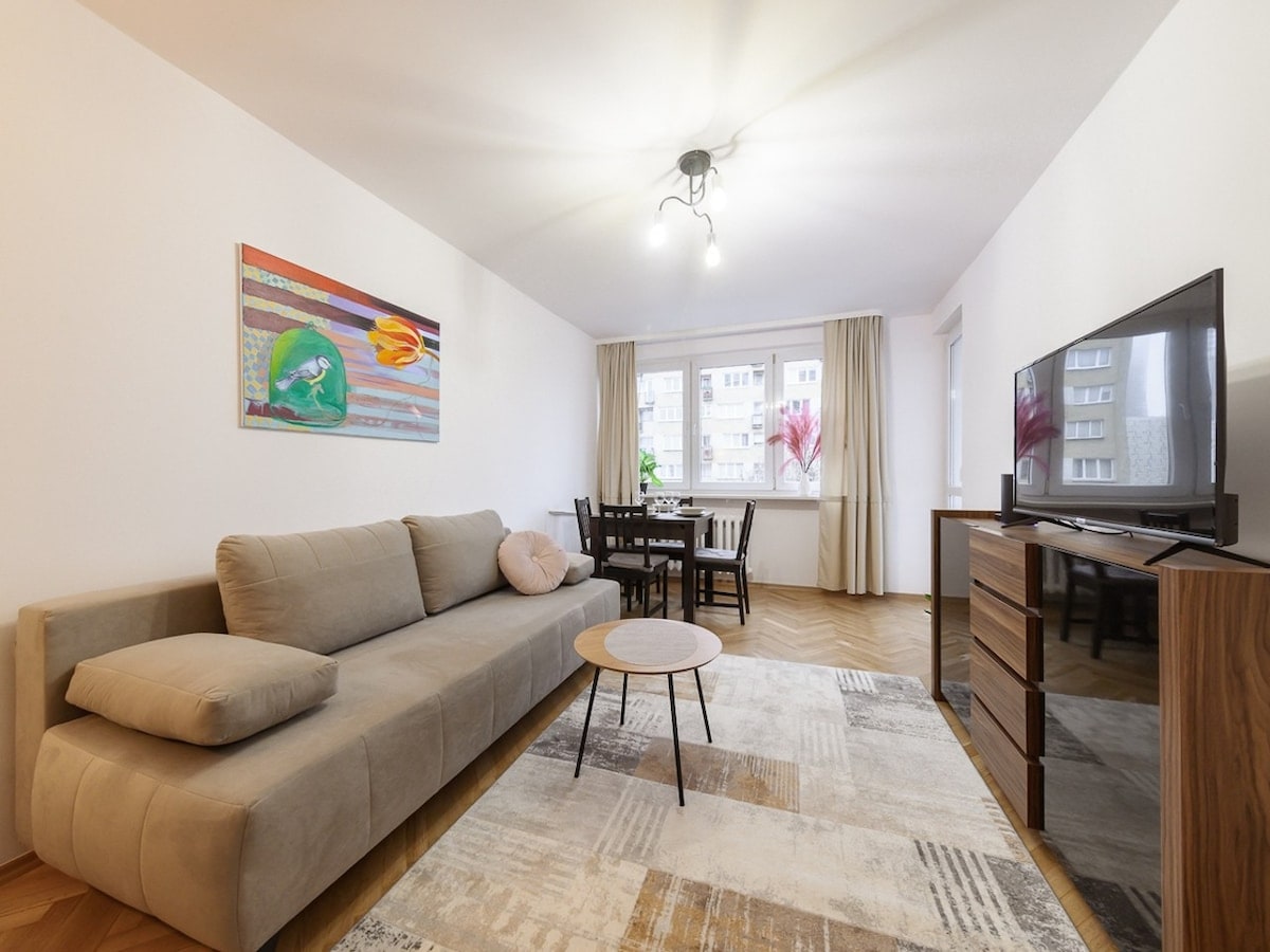Um apartamento totalmente equipado com uma varanda localizada na rua Panska. Localização central - a apenas 10 minutos da Estação Central e do shopping Zlote Tarasy, a poucos minutos a pé do Rondo ONZ, da Fabryka Norblina e do centro de negócios Rondo Daszynskiego. Perto de tudo, excelente transporte público e infraestrutura completa ao seu alcance! ⇾Sala de estar com sofá-cama, mesa de jantar e smart TV ⇾Quarto com cama de casal ⇾Cozinha (fogão, forno, micro-ondas, torradeira) ⇾Banheiro com chuveiro e máquina de lavar roupa.