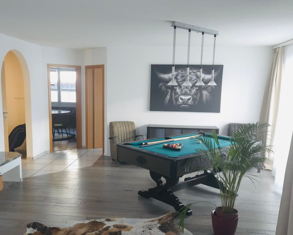 Spanning over 200m², you'll find 7 modern rooms for up to 12 guests. Perfect for families, wedding parties, or business trips. - Billiard table & home cinema for entertainment - Huge sun terrace with grill & lounge - Separate office for productive work - Large, fully equipped kitchen - 3 modern bathrooms In the heart of nature near the Albis Hill with numerous hiking trails. 5 min. to Türlersee and Park Seleger Moor, ideal for nature lovers too!