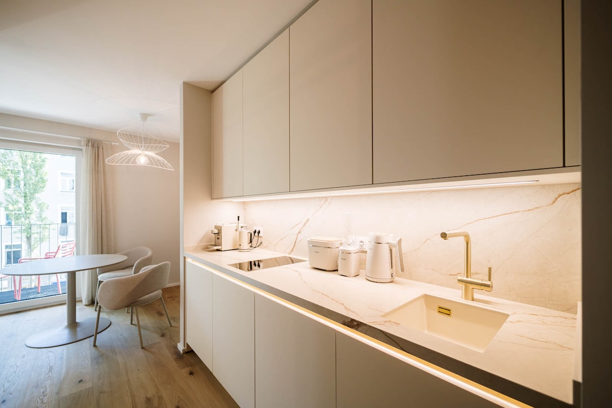 Uma pausa solo na cidade? Nossos micro Studios compactos têm tudo o que você precisa para uma estadia curta em Munique. Em 16m², você terá uma confortável cama de casal EU de 150 cm x 200 cm. Embora não haja sofá, você terá todos os itens essenciais – uma cozinha totalmente equipada com mesa de jantar, micro-ondas, máquina de lavar louça, máquina de lavar/secar roupa e equipamento de cozinha de designer. Além disso, vantagens como ar condicionado, um chuveiro elétrico com produtos de higiene pessoal Kinsey Apothecary, cortinas blackout, Wi-Fi super rápido, uma Smart HDTV com Chromecast e um kit de itens essenciais Locke.