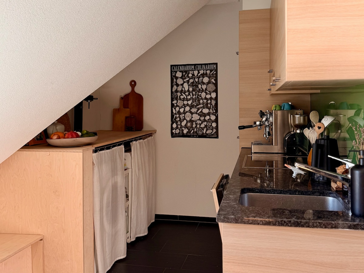 O espaçoso estúdio renovado (25 m2) no terceiro andar tem um banheiro privativo separado em frente ao corredor não privativo. Tem uma cama king size, geladeira, máquina de café, chaleira de água e uma mesa para trabalhar com Wi-Fi de alta velocidade. No corredor, você encontrará uma pequena cozinha com micro-ondas, máquina de lavar louça, pia, máquina de lavar/secar e impressora/scanner/copiadora. Aquecimento com calor da terra. Estamos quase neutros em CO2 graças ao nosso novo telhado solar.